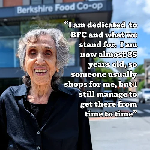 “In 2004 I moved from Brattleboro, Vermont, to Sheffield, MA. In Brattleboro I had been employed at the Brattleboro Food Co-op for many years, and one of the first things I did when I arrived in Sheffield was to look up the local food co-op. You had just moved into your [first Bridge Street] building from your original "hole in the wall." I became an active member of the Berkshire Food Co-op and shop here to this day. I miss the former store, but I am dedicated to BFC and what we stand for. I am now almost 85 years old, so someone usually shops for me, but I still manage to get there from time to time, and I wish you all the best.”