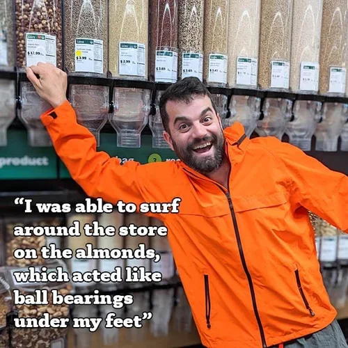 “When the bulk aisle first opened, I was a mischievous young lad, and I unleashed the entire supply of dark chocolate covered almonds onto the floor. With a toasted multigrain Naan bread, I was able to surf around the store on the almonds, which acted like ball bearings under my feet, swiping groceries off the shelf and into my mother's awaiting cart. Here we are, years later, and she has yet to live down the embarrassment she experienced that day.”