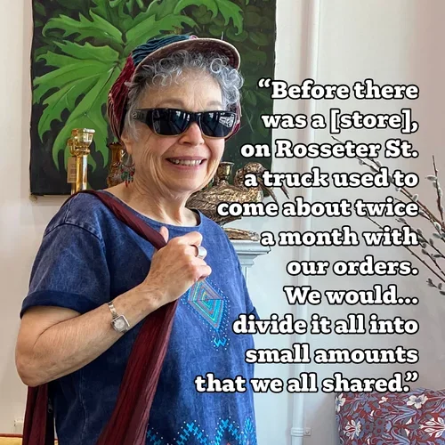 "Do you know how the co-op began? I remember before there was a co-op on Rosseter St. a truck used to come about twice a month with our orders. There was a group of us. We would take 25 pound bags of brown rice, almonds, or 12 juices to a carton etc. off the truck and divide it all into small amounts that we all shared. We even had a scale to measure. The truck parked in front of the building on Rosseter St. which eventually became the original Co-op. And many of us volunteered back then at the Co-op. That was a long time ago."