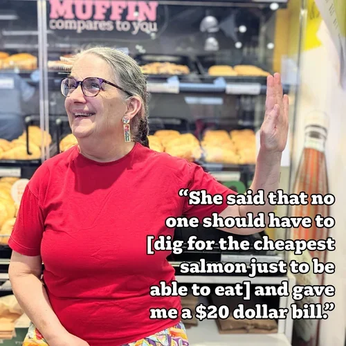 “About 10 years ago I was struggling financially. I was going through the cooler looking for a prepackaged salmon and rice that I could afford. A woman came up next to me and kindly asked what I was doing. Feeling very ashamed and on the verge of tears I explained. She said that no one should have to do that and gave me a $20 dollar bill. I felt so blessed. And I have paid it forward.”