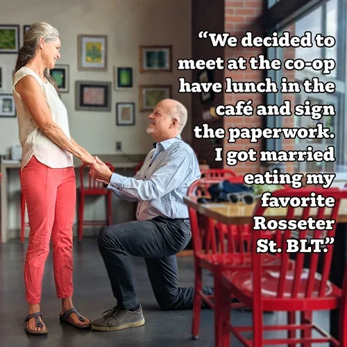 “I got married in the Co-op café! This is what I tell people and it’s true. When my husband and I got married in 2007, our friends who officiated had flown in from Colorado and forgot to get their license to marry us. After they admitted this (a few days after the ceremony!!) I remembered that a friend of mine had just obtained her ministers license by mail from Nevada which allowed her to marry people. We decided to meet at the Co-op have lunch in the café and sign the paperwork. My husband, unfortunately, had a meeting come up, so I got married (alone!) at one of the little tables in the other Bridge street location eating my favorite Rosseter St. fakin’ bacon BLT. Both the setting and the marriage were perfection…. Still are.”