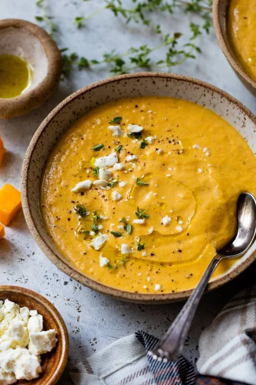 This cozy roasted butternut squash and feta soup is perfect for chilly fall days. With a rich blend of caramelized squash, roasted garlic, and savory feta, it's a comforting dish that's easy to make yet full of flavor. Fresh herbs and a velvety smooth texture make this soup an ideal starter or light meal. Add a hint of spice with chili paste or crisp for an extra kick!